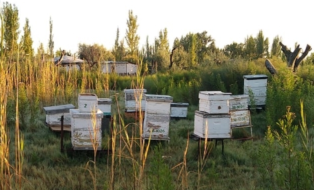 En la imagen de la derecha pueden observarse algunas de nuestras colmenas que están ubicadas en Corralitos, Guaymallén, Mendoza.